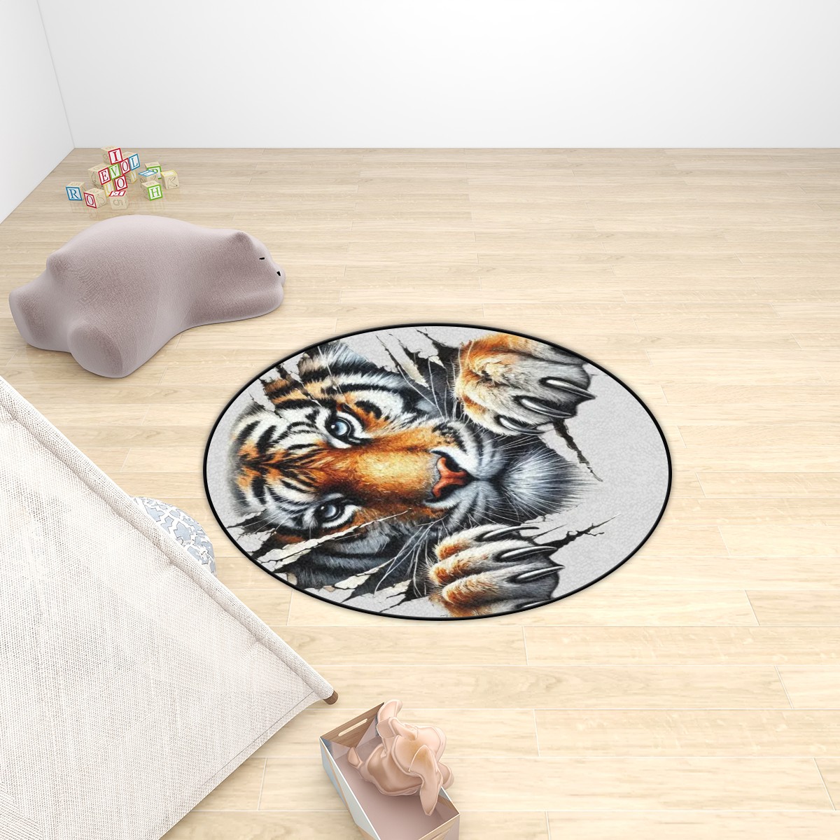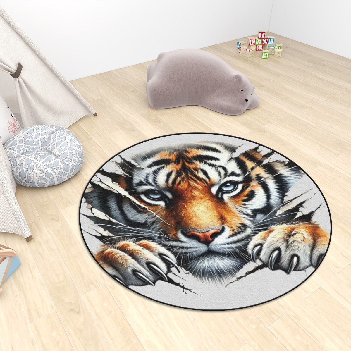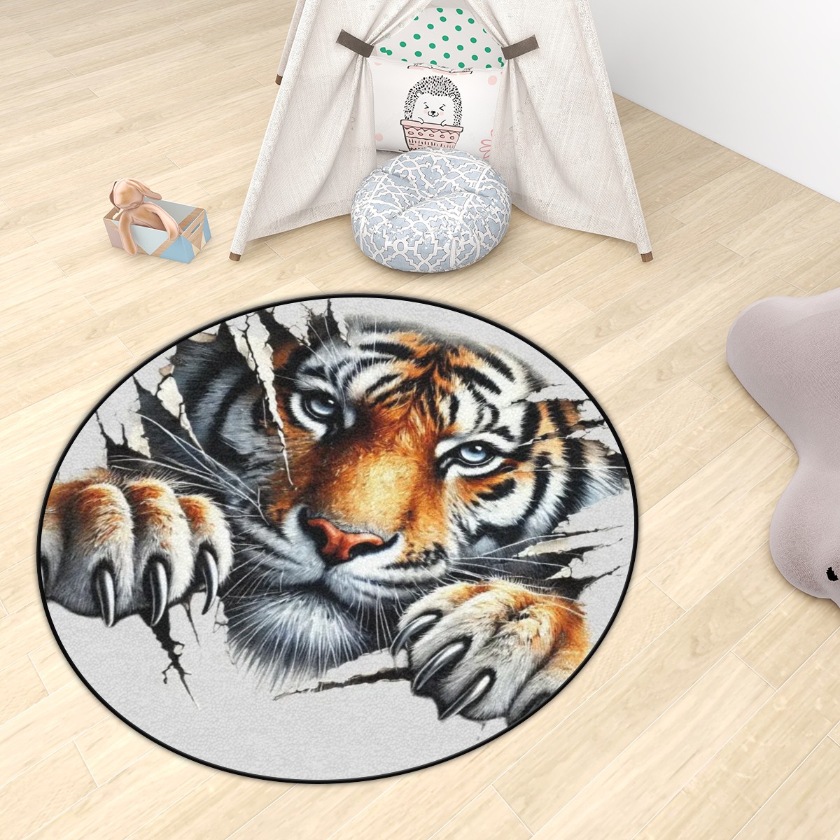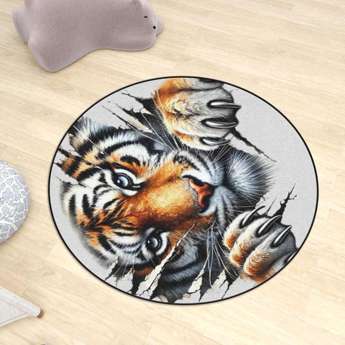 - Perfect for your home. Tiger Round Rug – This carpet is ideal in your living rooms or kids’ play areas, this Plush carpet combines durability with comfort. Available in multiple sizes (36”–72”), it’s ideal for families, pet owners and anyone who loves bold animal designs.